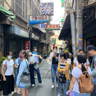 沿著遺址,我們以五感的方式讓大家自行搜尋附近有什麼景物、有什麼聲音、有什麼味道等等的,放下手機後的五感通常是最敏感最獨具特點的,請每個人將自己的感受分享到slido上彙整,一同討論著為何這裡會有青草行、針織業,並回溯以往墩腳這裡過去是如何發展的,從葫蘆墩顯眼地標到人口聚集,人口多了以後就聚集了攤商,攤商與住家為了增加營業與生活空間便不斷地挖掘土墩,導致現在已經看不到明顯的葫蘆形狀了,一切都是有跡可循的,但未來這裡的一切是否又會改變呢?至少當下的我們已將這些記憶牢牢地放在心中。
